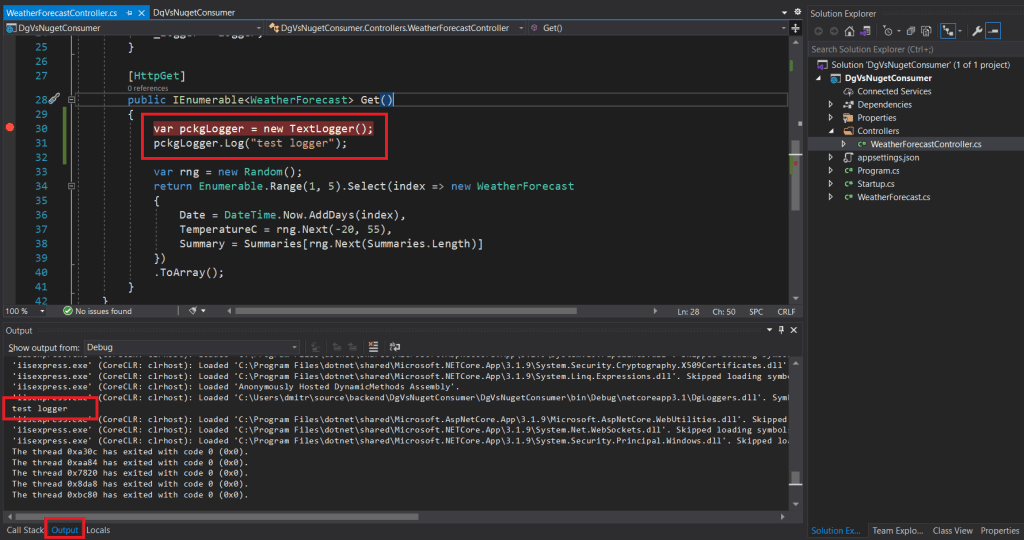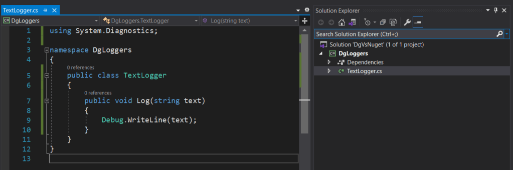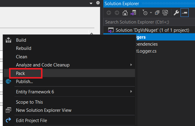 This should produce a nupkg file in Debug(Release folder on server or in production mode) folder that is inside the bin folder which in its turn is placed in the class library root folder. For example C:\Users\dmitr\source\backend\DgVsNuget\DgLoggers\bin\Debug