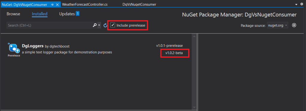 For example 1.2.3, 1.5.9-prerelease. In general whatever suffix you put the Nuget package manager will put it under prerelease type. This means you would have to tick ‘Include prerelease’ in Visual Studio when searching for nuget packages.