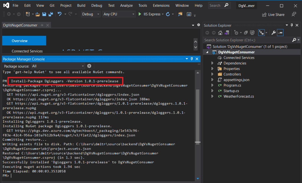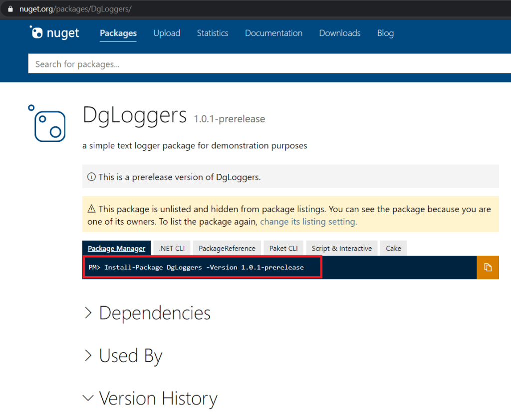 Since we set this package as Unlisted we need to use the package manager console and use the install command where you specify the version.