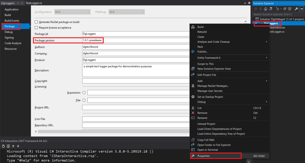 As you can imagine the process is the same as when we publish the package. We need to change the version in the Project Options Package section. Then pack it. To note we need to use the newly generated nupkg file name. For instance DgLoggers.1.0.2-beta.nupkg