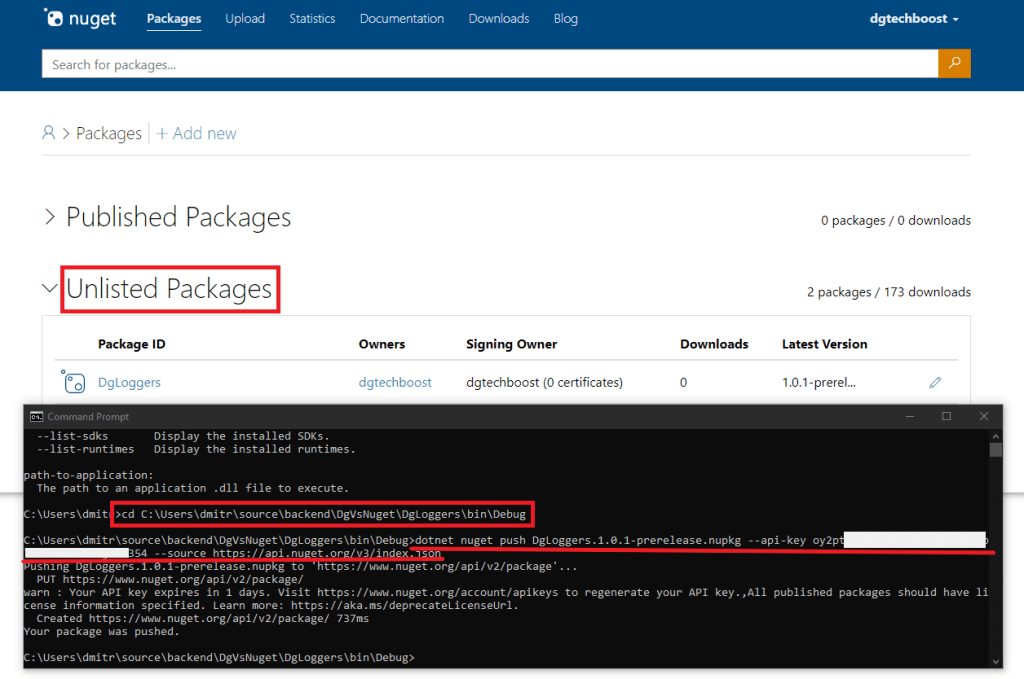 For me the command would look like so ‘dotnet nuget push DgLoggers.1.0.1-prerelease.nupkg –api-key qz2jga8pl3dvn2akksyquwcs9ygggg4exypy3bhxy6w6x6 –source https://api.nuget.org/v3/index.json’