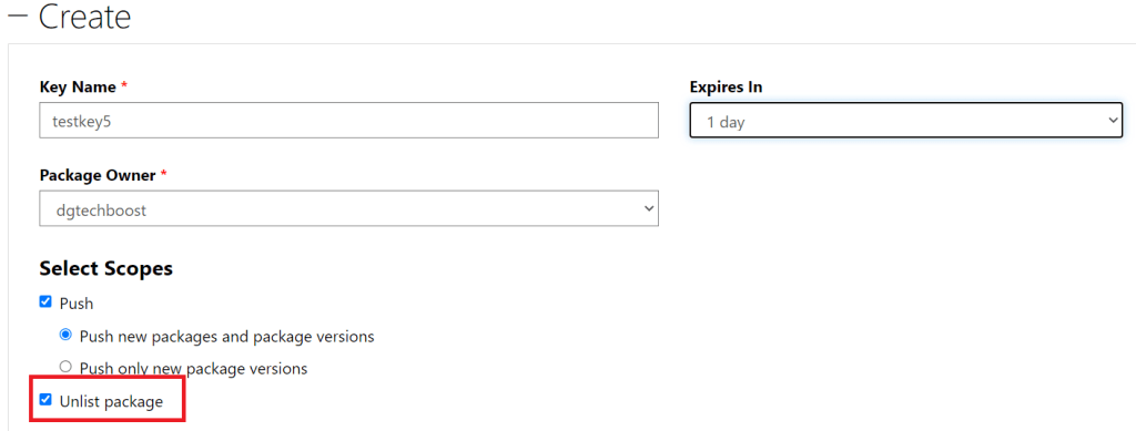 The required details we need are the same as for when you publish the package. For this we need to generate the api key at nuget.org. When generating the api key make sure Unlist package scope is ticked.