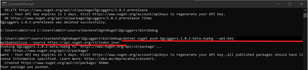 Then we need to navigate to the folder where our nupkg file lives. For me it’s C:\Users\dmitr\source\backend\DgVsNuget\DgLoggers\bin\Debug